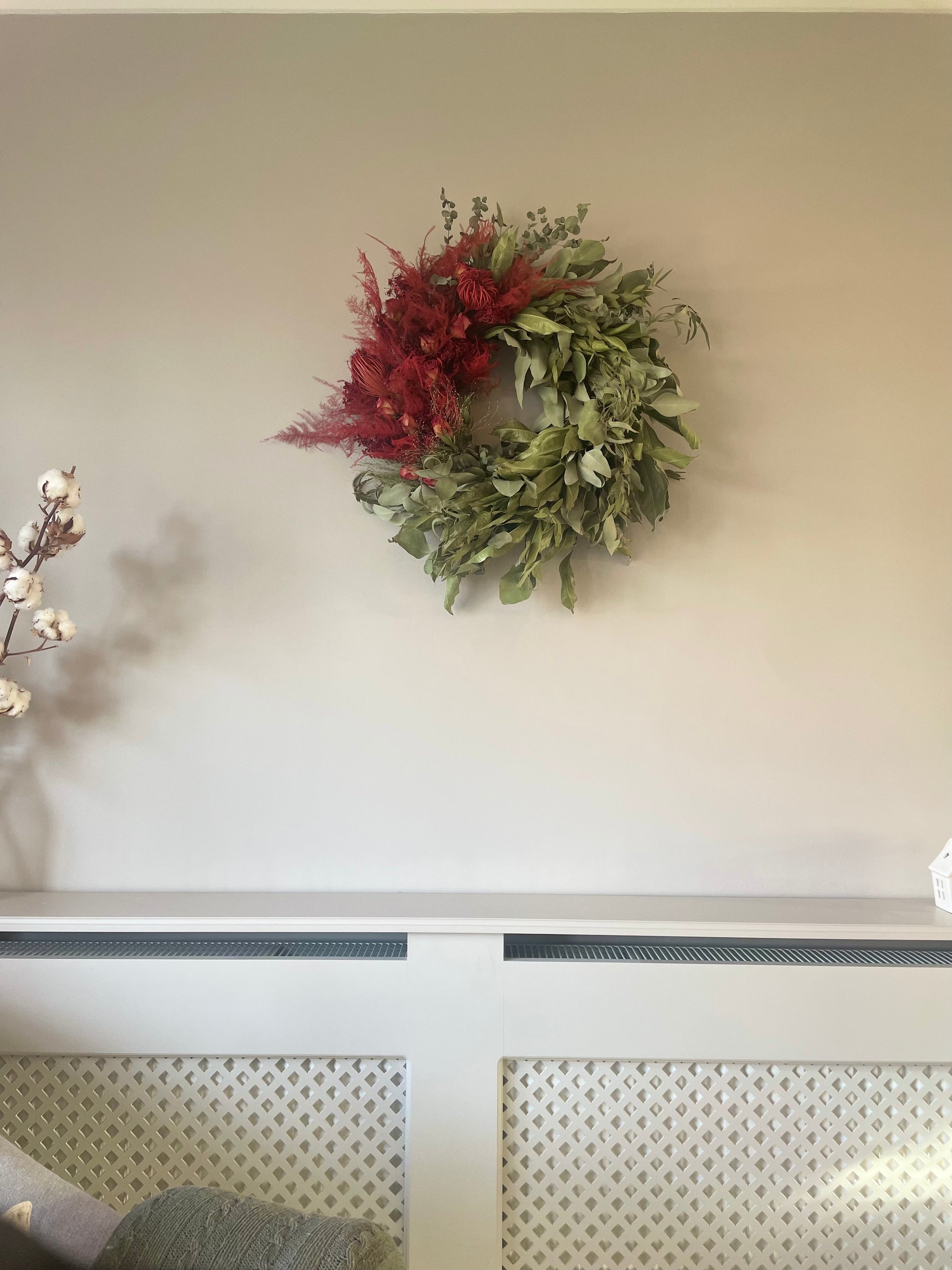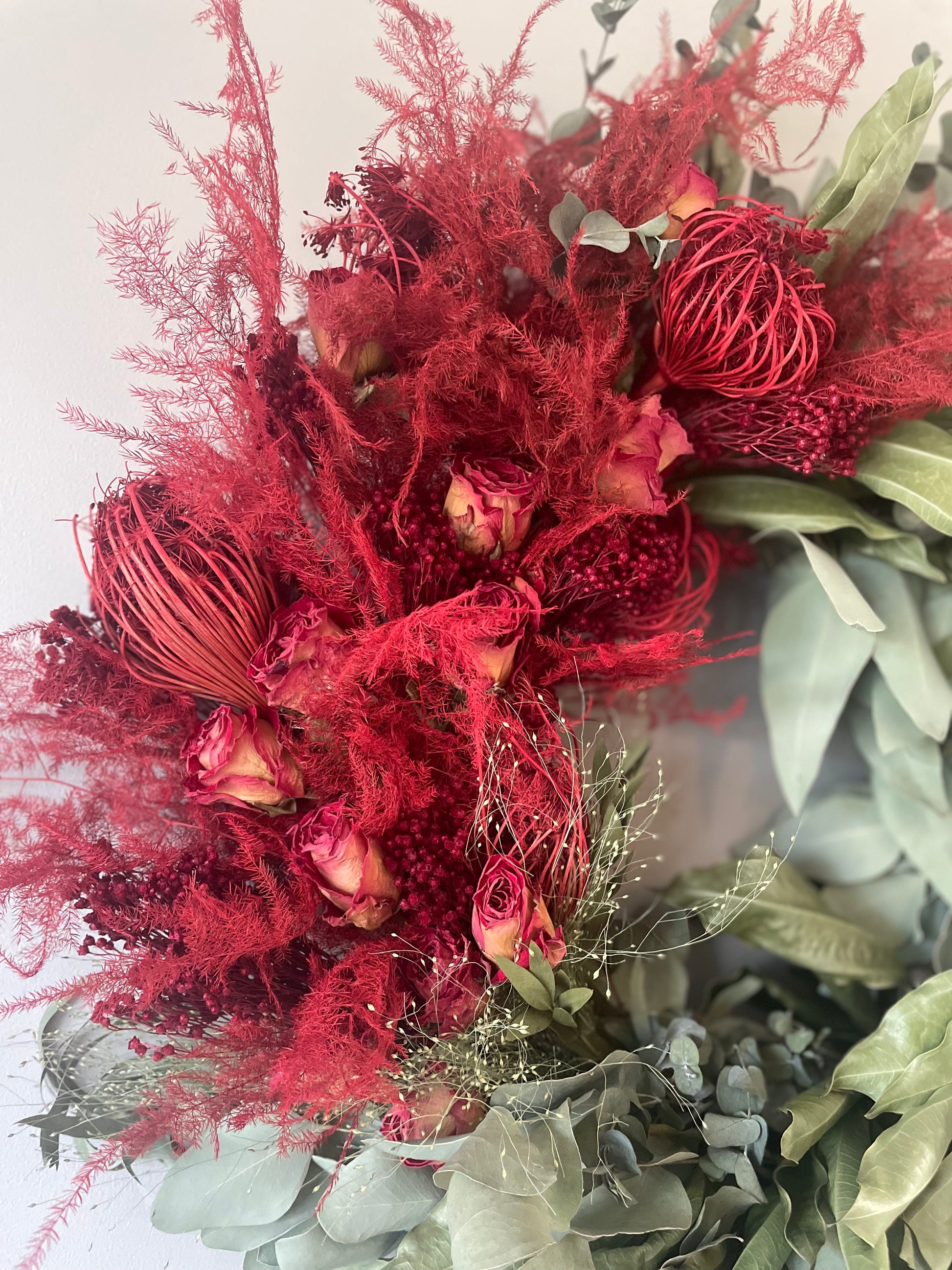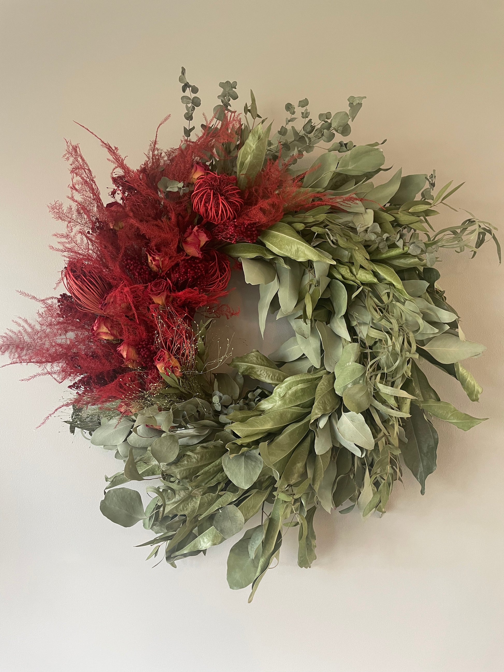 Dried everlasting foliage wreath with a dozen red roses. Wreath base 30cm. Overall finished size approx 60cm. Indoor use only.