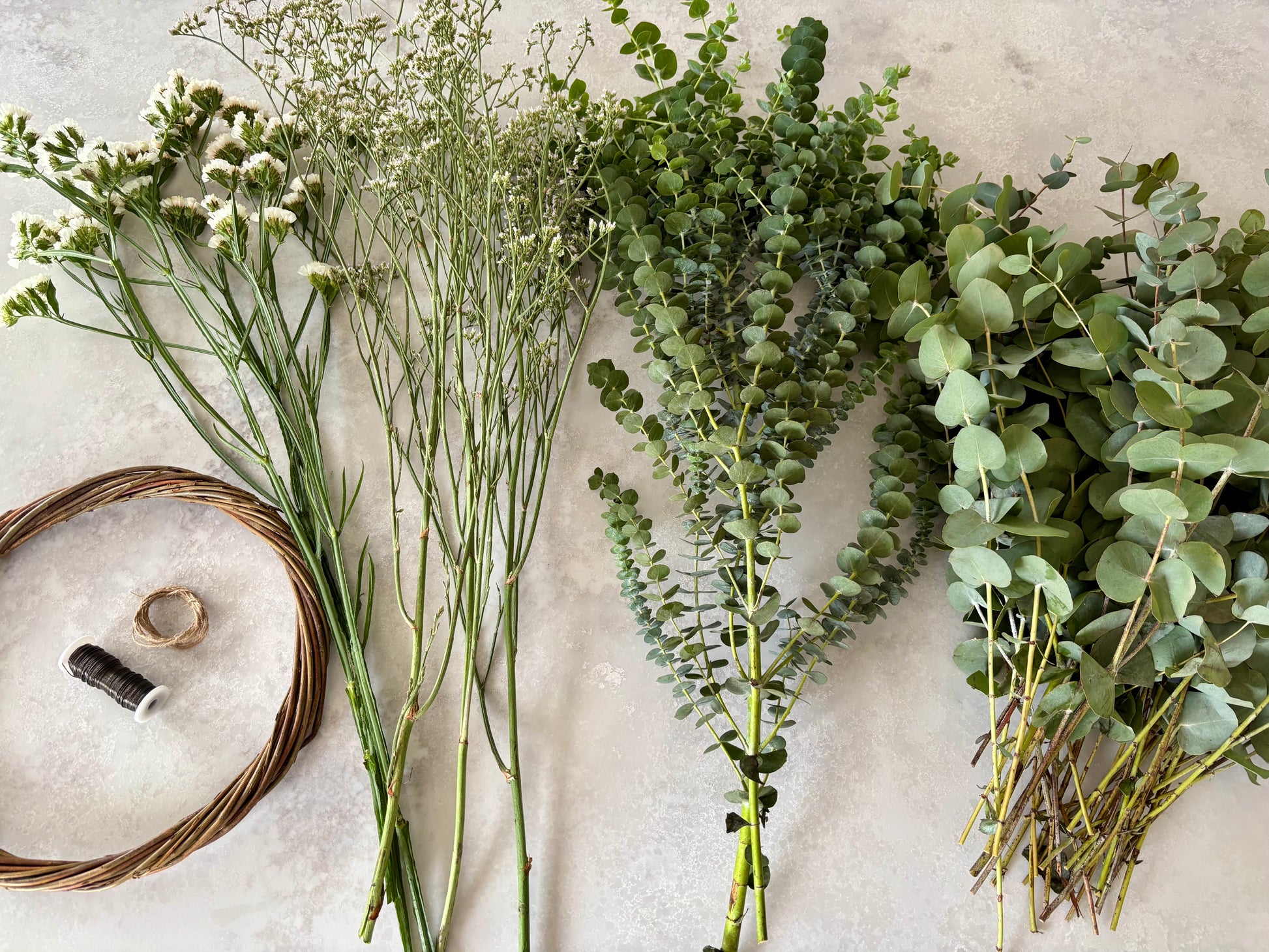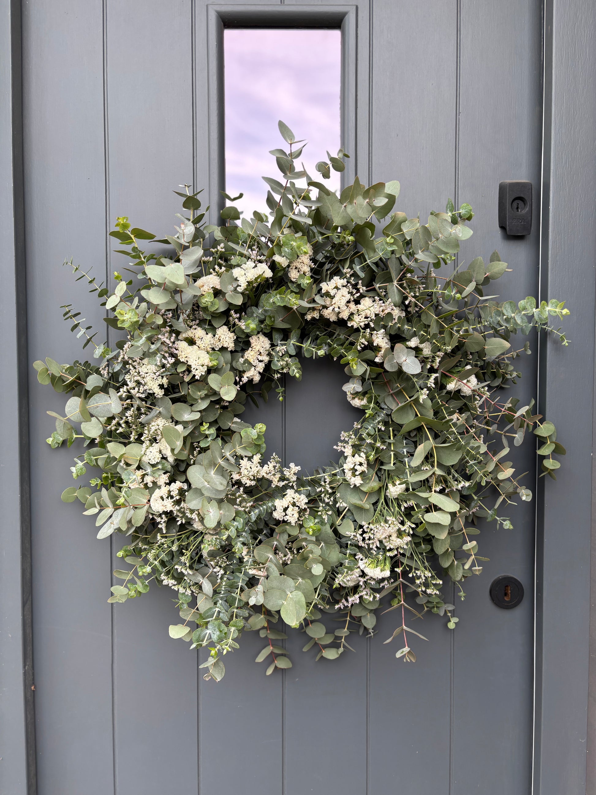 A kit containing everything you need to make your own fresh foliage wreath containing Eucalyptus, Limonium, Statice and step by step instructions.