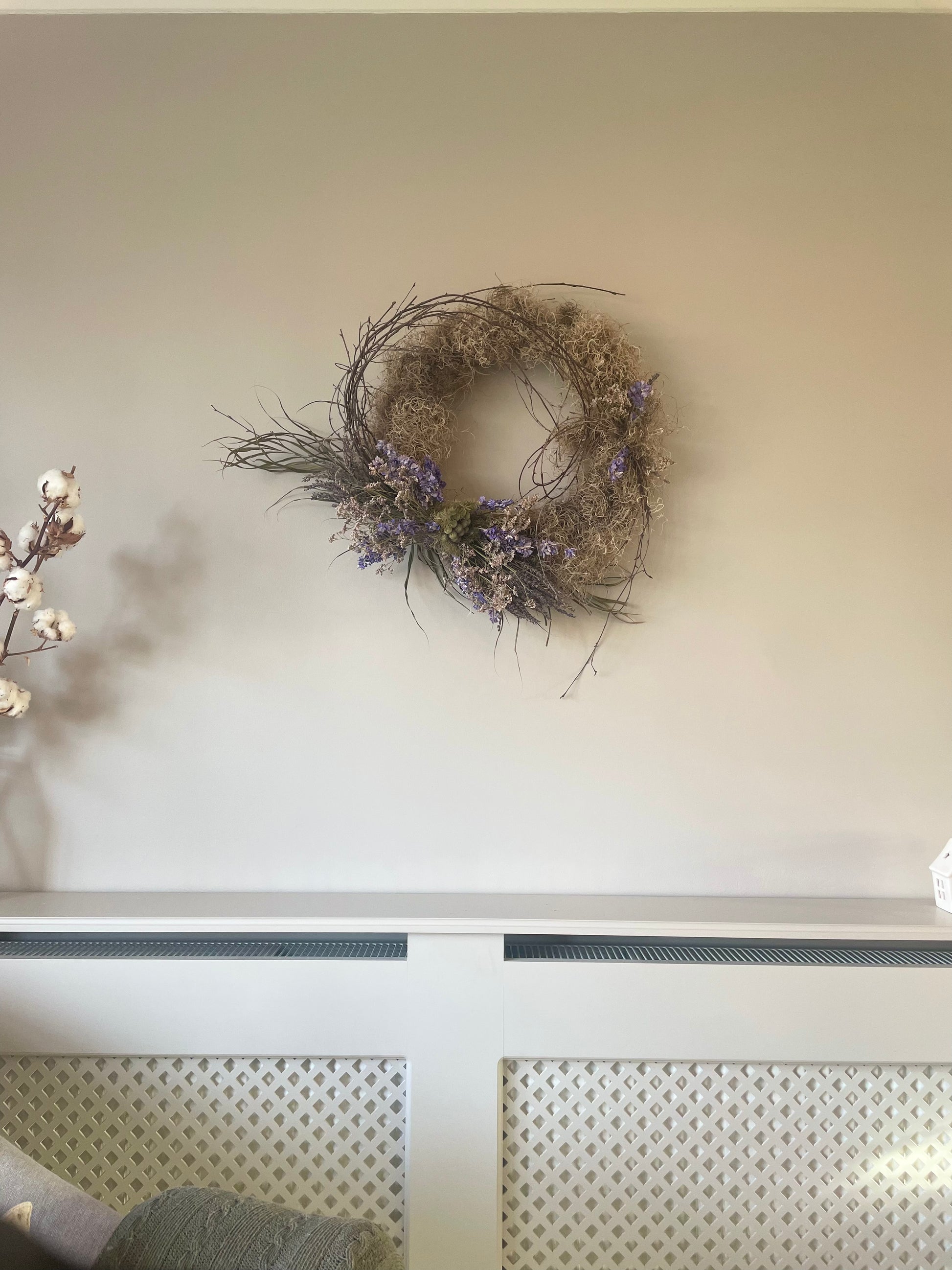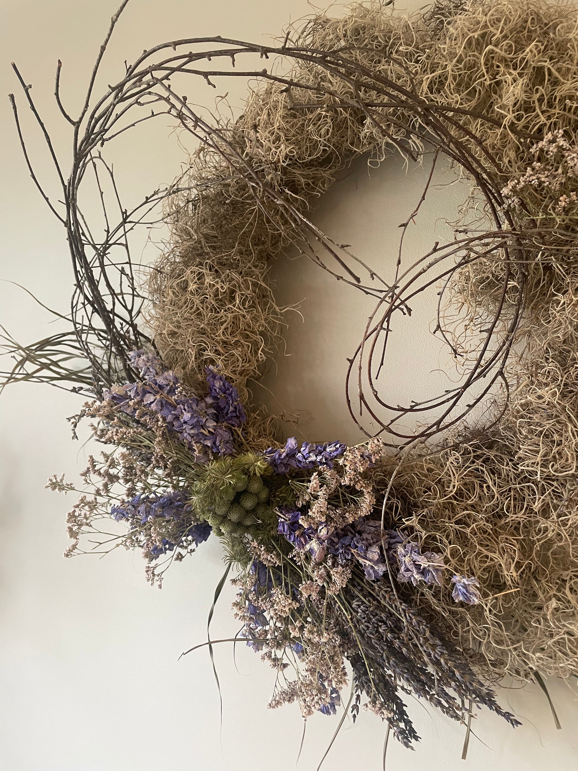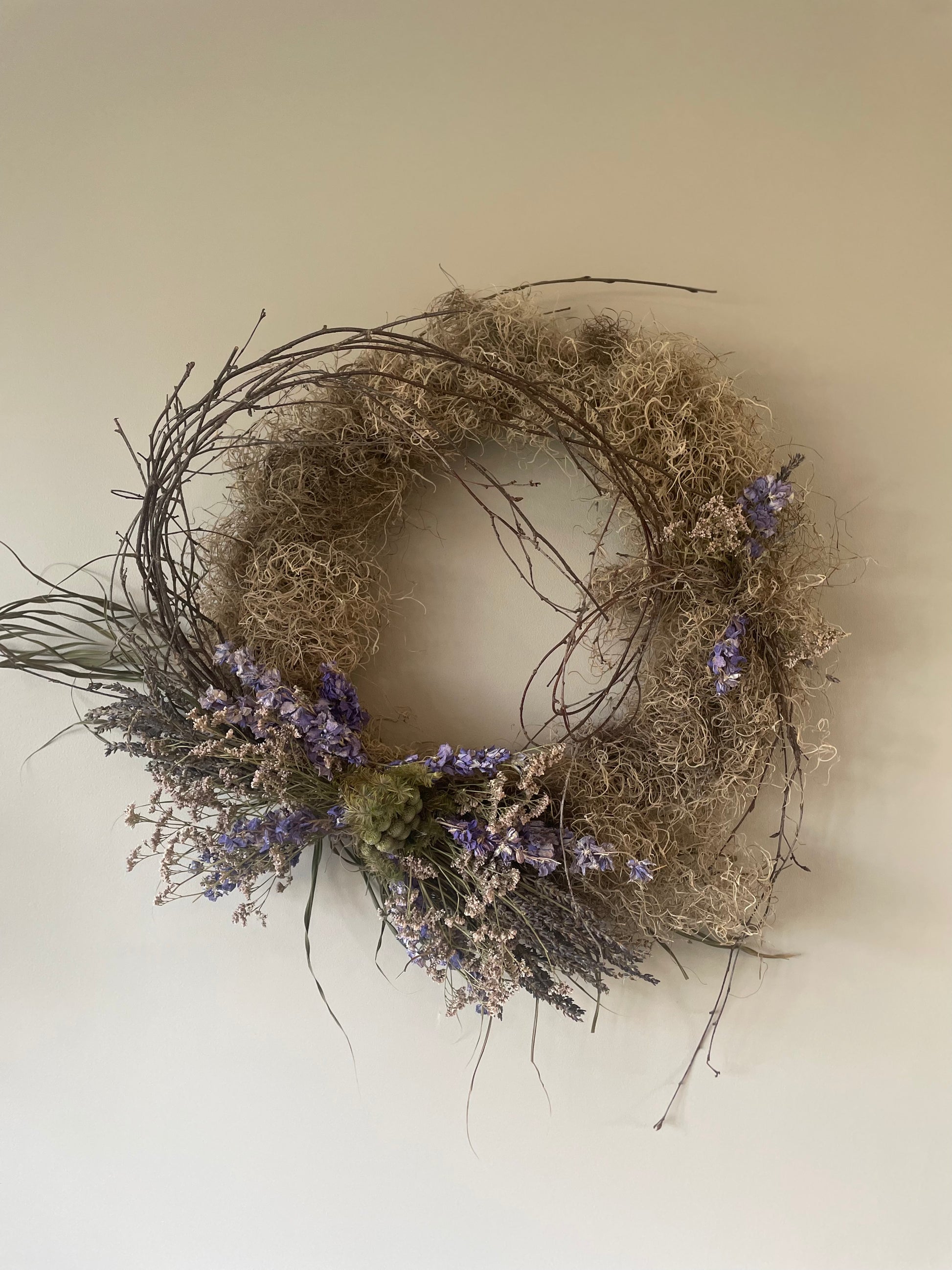Small purple delphinium and lavender wreath with Sea Moss. Wreath base 30cm. Overall finished size approx 60cm.