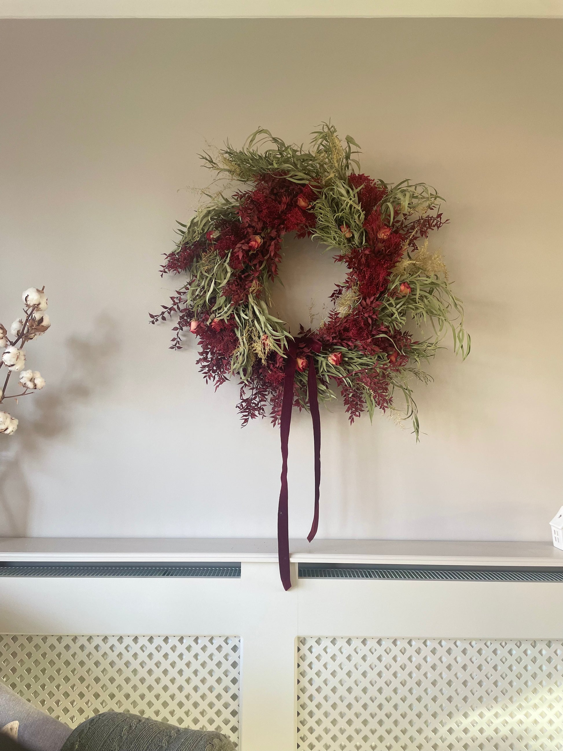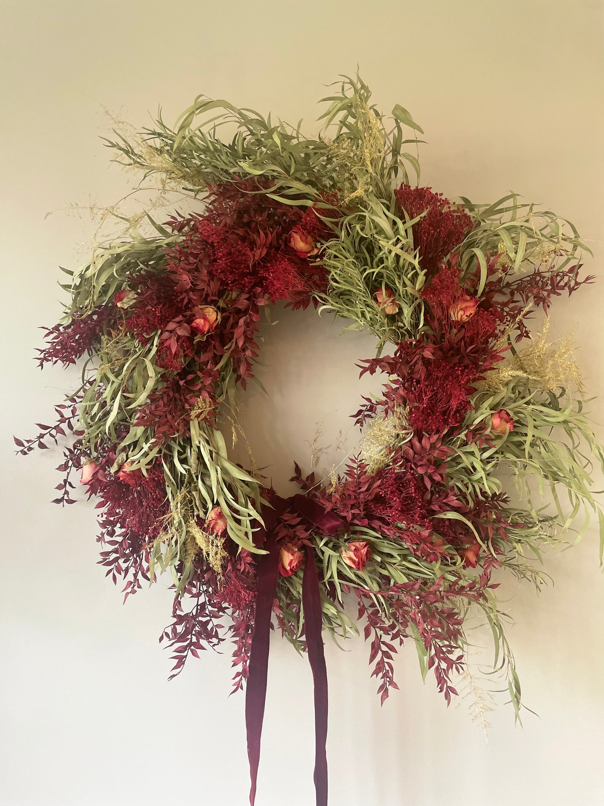 Wreath filled with Eucalyptus, Red Roses, Red Ruscus and finished with gold ferns. Wreath base 40cm. Overall finished size approx 65cm. Indoor use only.
