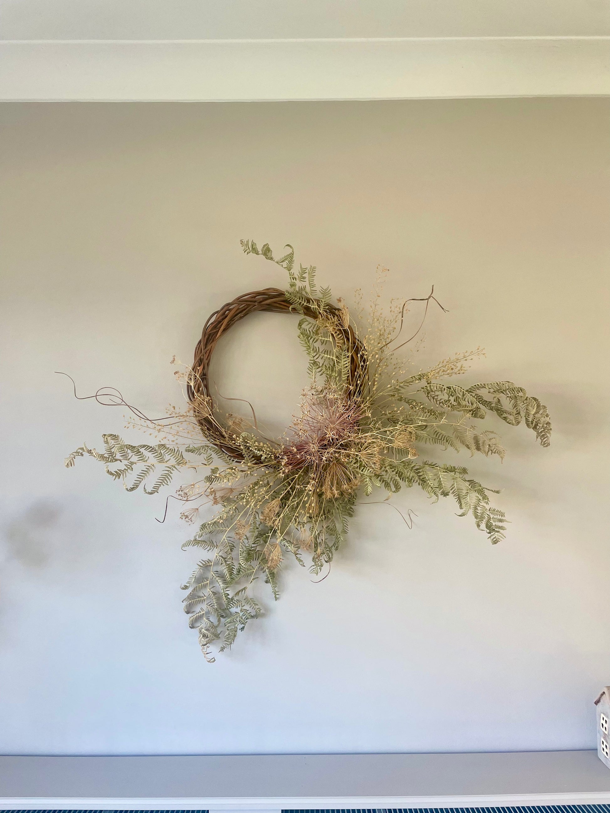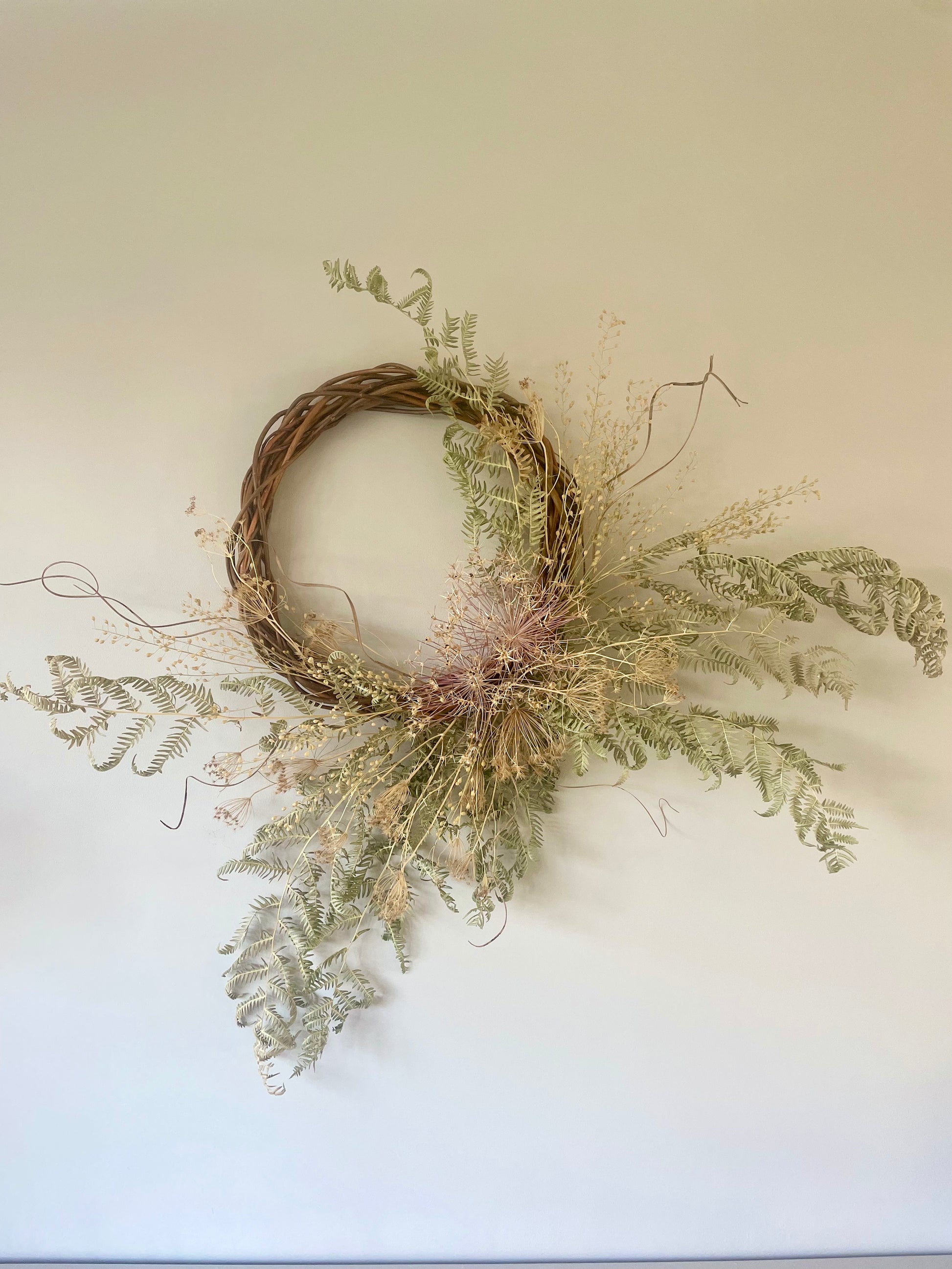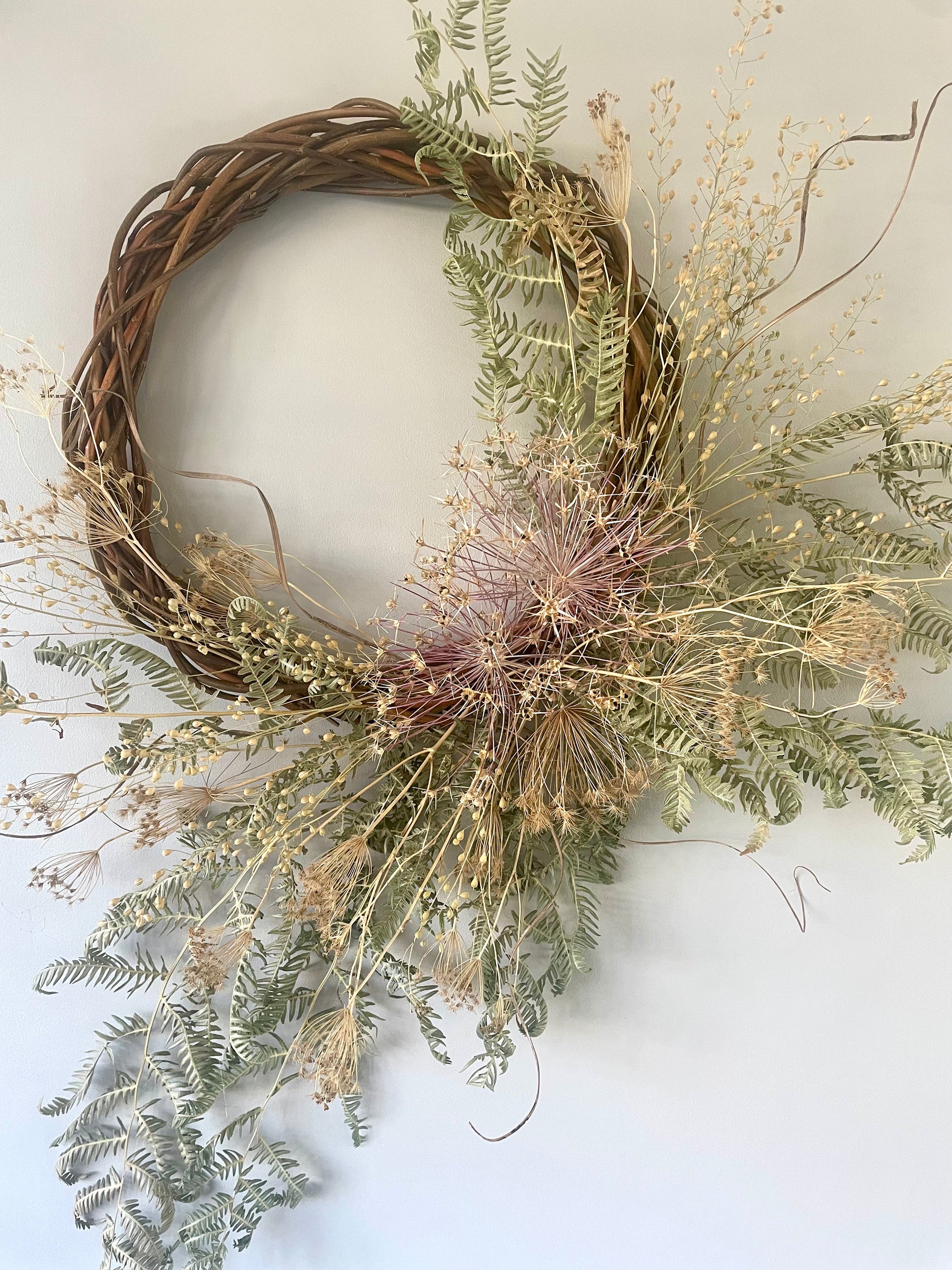 A simple and understated wreath made up using bracken ferns, penny cress, burleurun and allium seed heads.