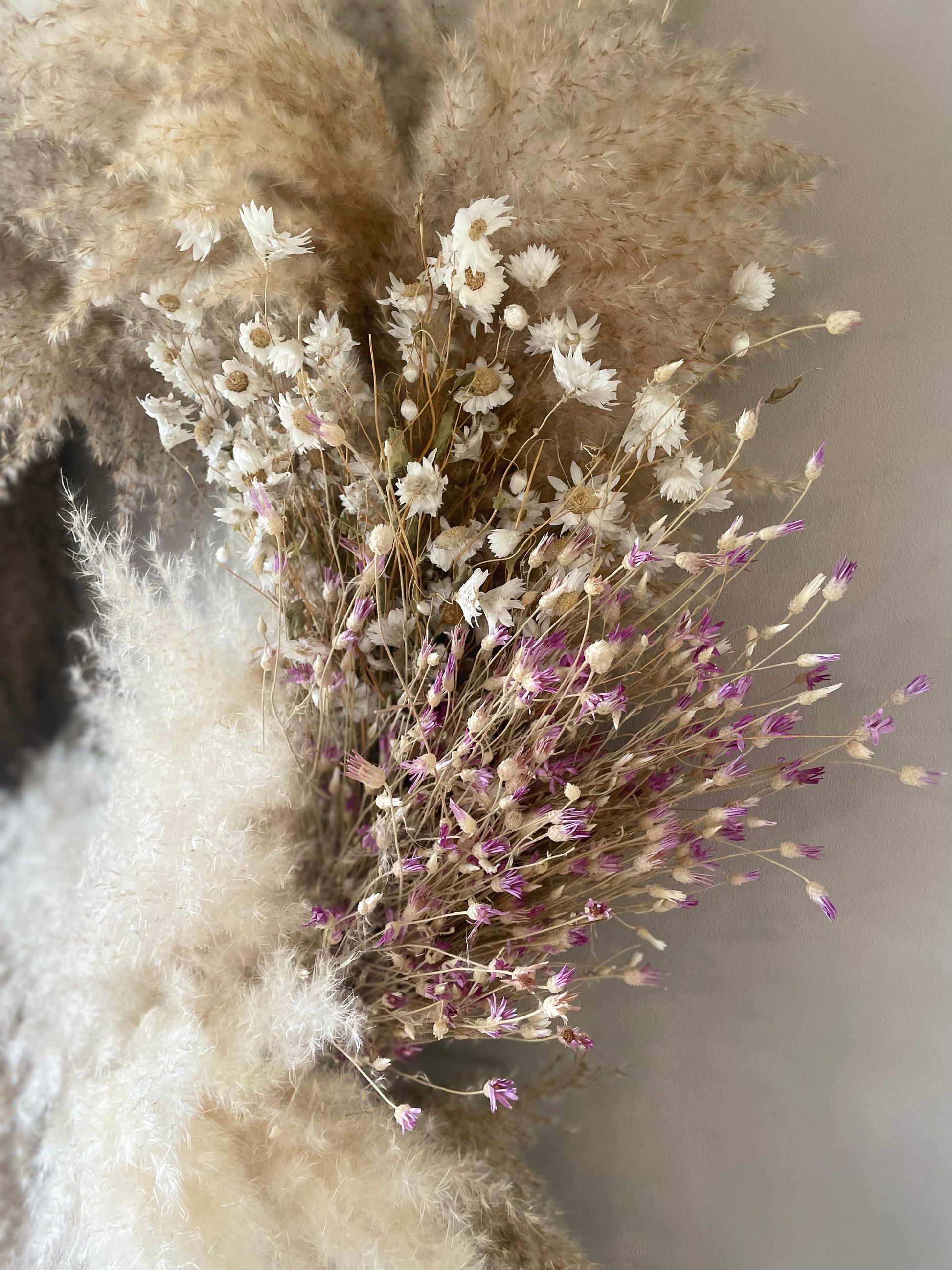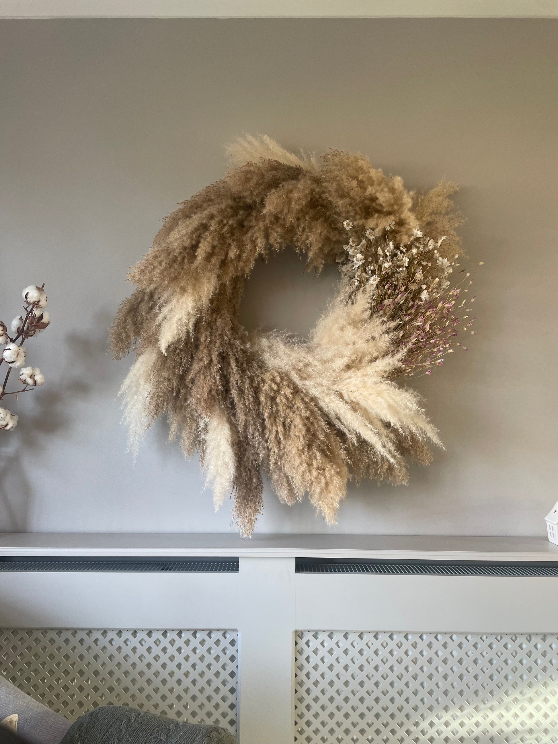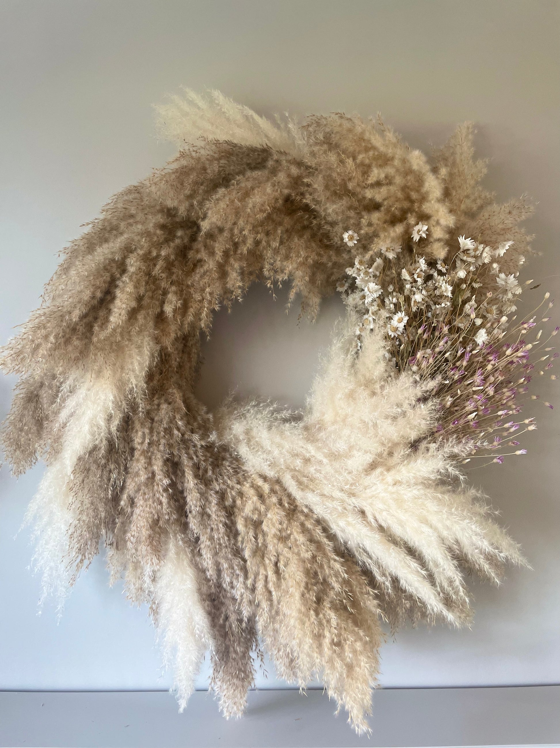 Extra large everlasting statement wreath made from various pampas grass, daisy’s and depressa flower. Wreath base 55cm. Overall finished size approx 90cm. Indoor use only.